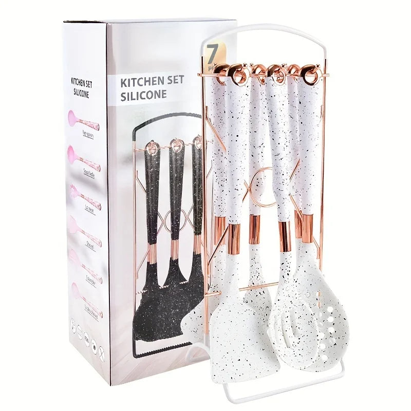 Add elegance to your kitchen with this 6-piece gold-plated silicone utensil set. Featuring heat-resistant silicone heads and stylish gold handles, this set includes all the essentials for everyday cooking. Comes with a matching storage rack to keep your tools organized and accessible.